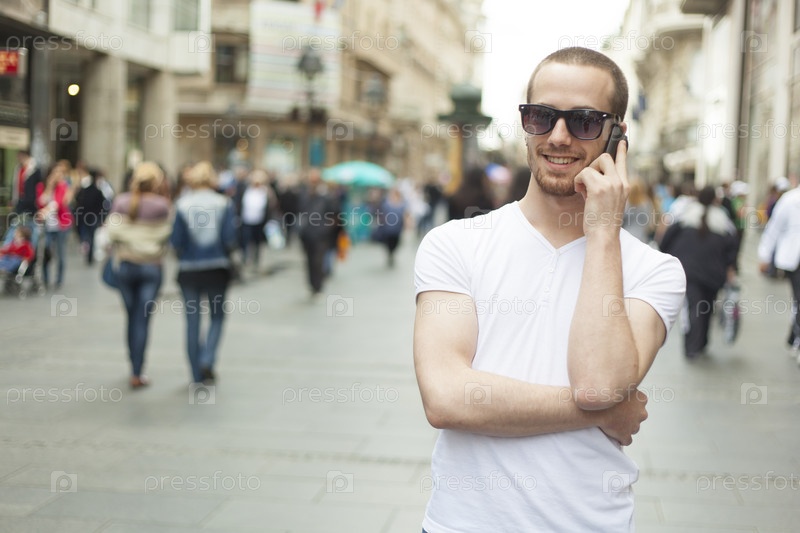 Молодой человек в солнцезащитных очках и с телефоном на улице города