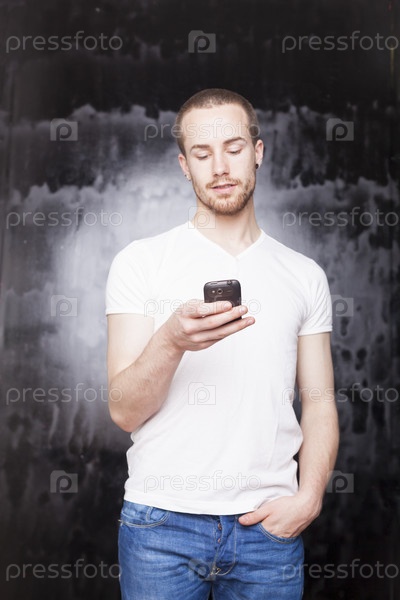 Улыбающийся человек использует смартфон