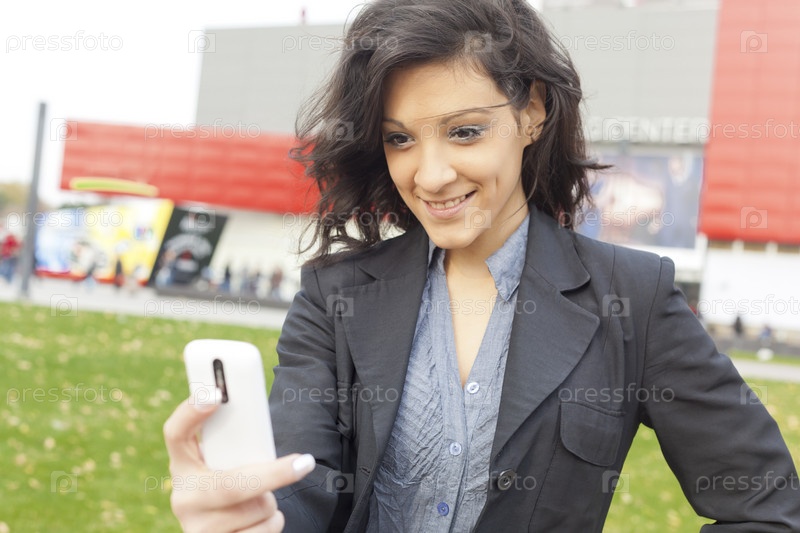 Молодая женщина идет с сотовым телефоном