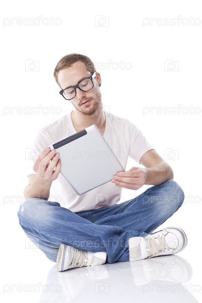 Мужчина читает на планшетном компьютере