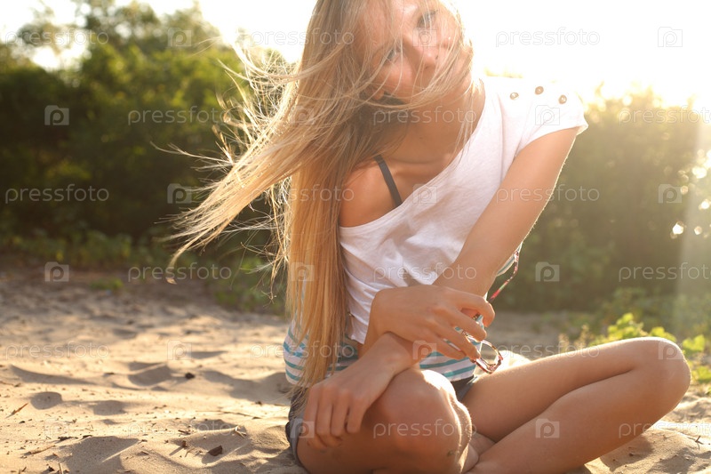 Девушка сидит у реки в лучах солнца