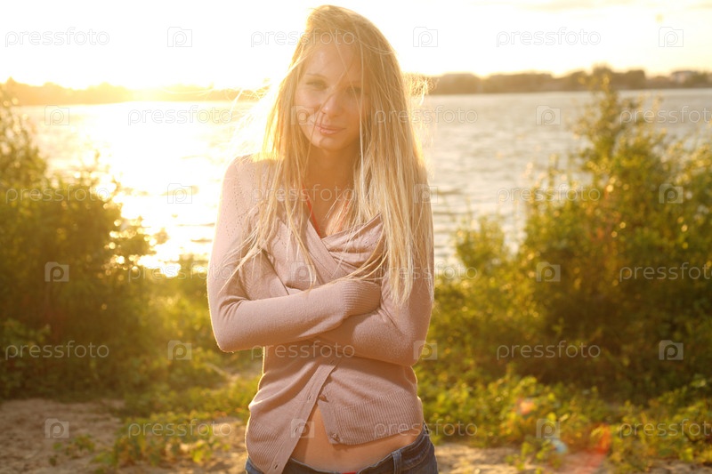 Девушка у реки в лучах закатного солнца
