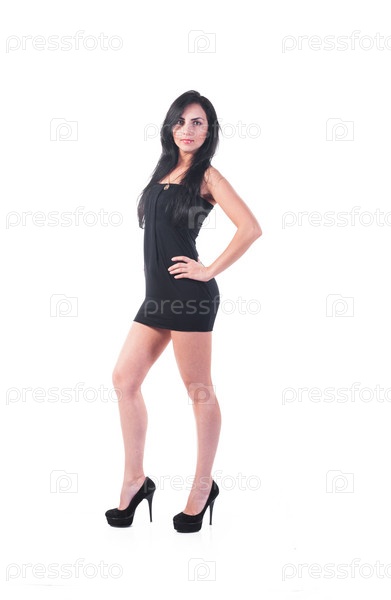 Молодая красивая женщина в черном платье, изолированная на белом фоне