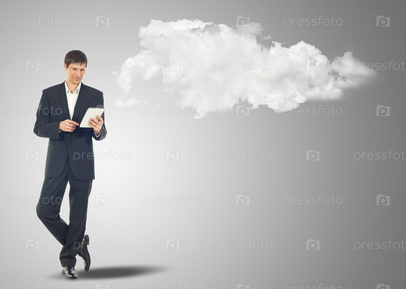 Бизнесмен пользуется интернетом на сенсорном экране планшетного компьютера и облако рядом с ним