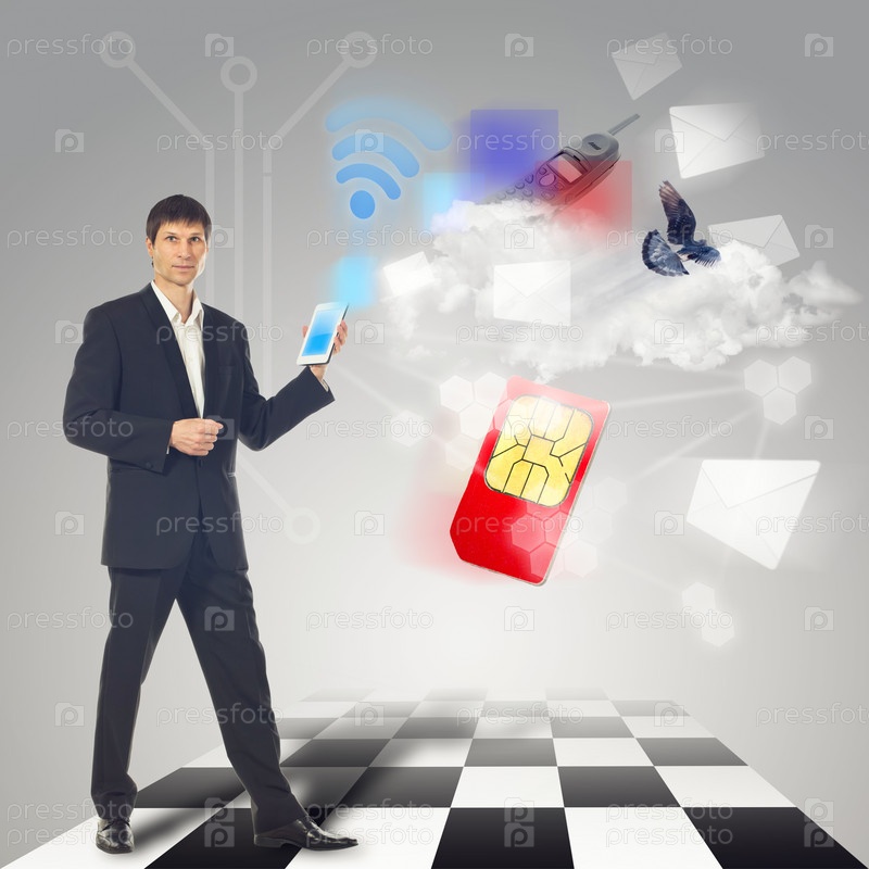 Молодой предприниматель с планшетным компьютером и символами связи
