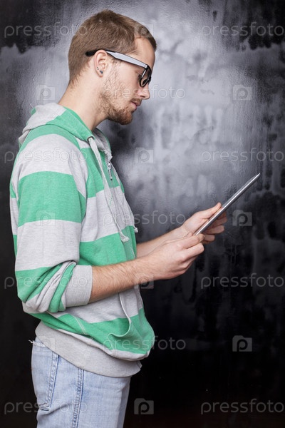 Симпатичный компьютерщик с планшетным компьютером