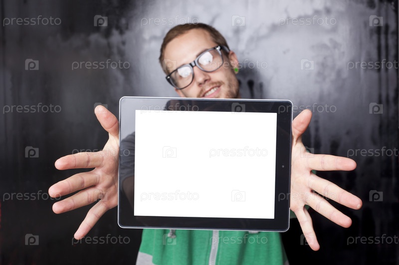 Симпатичный зануда с планшетным компьютером