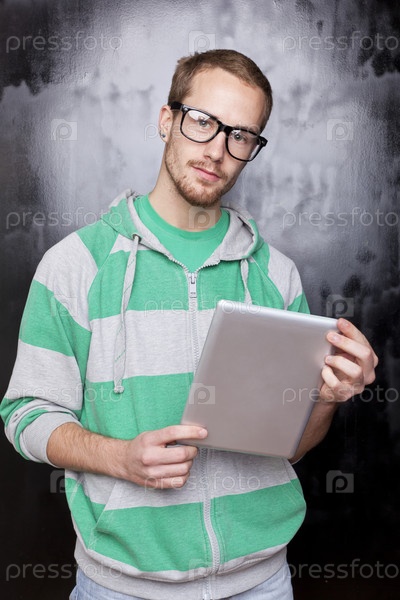 Симпатичный зануда с планшетным компьютером