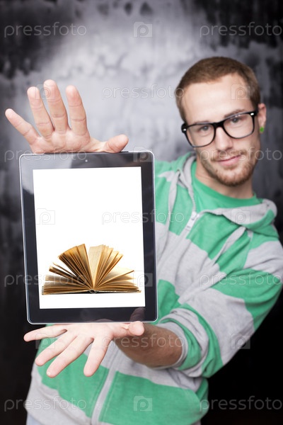 Симпатичный ботаник с планшетным компьютером с книгой на дисплее. Цифровая библиотека