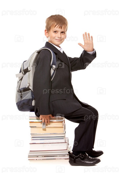 Школьник сидит на книгах