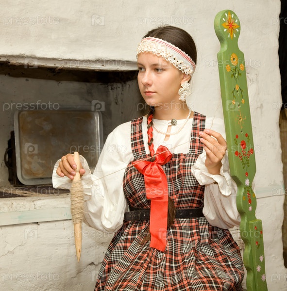 Девушка прядет шерсть