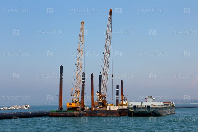 Понтон с грузовыми кранами в море