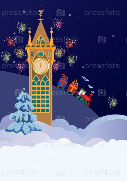 Векторная иллюстрация. Рождественский замок и поезд с подарками