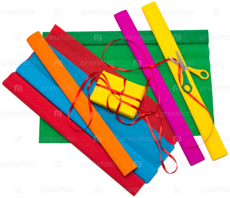 Упаковочная бумага, ножницы и подарочная коробка с лентой на белом фоне