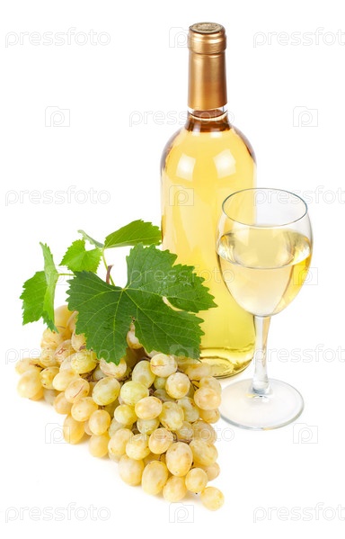 Белое вино и виноград на белом фоне