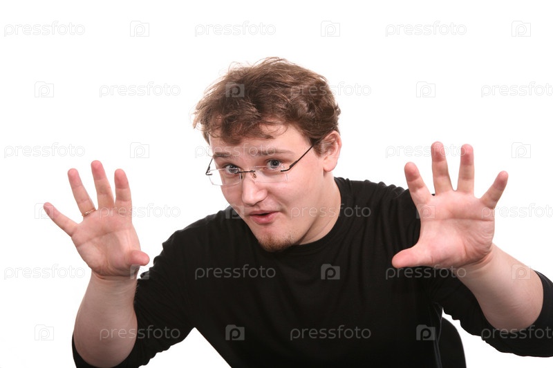 Молодой мужчина в очках показывает ладони