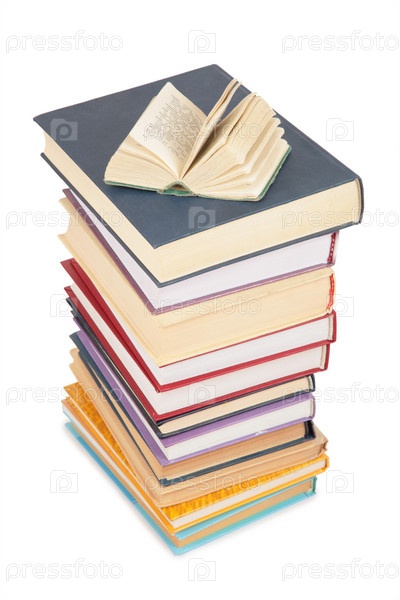 Маленькая раскрытая книжка лежит на большой стопке книг