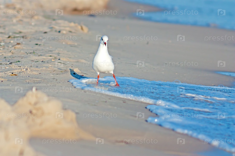 Чайка на пляже убегает от волны