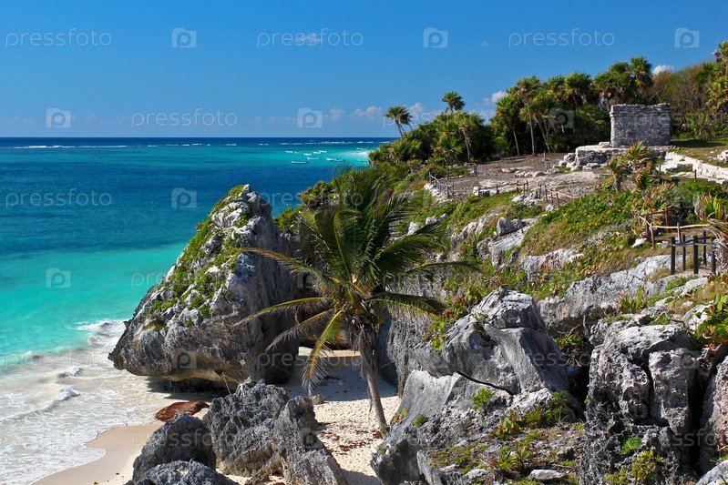 Пирамиды Тулум в Мексике на фоне тропического пляжа в голубой водой