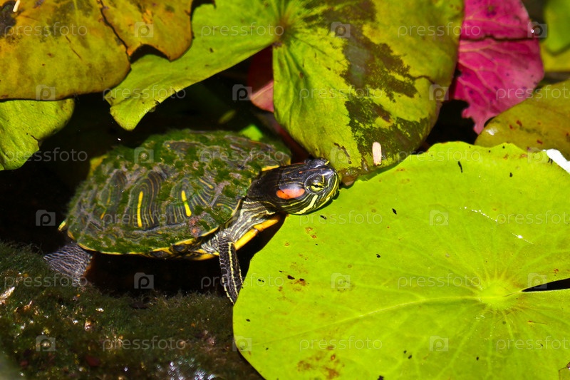 Маленькая черепашка между листьми кувшинок в озере Гранд Сенот в Мексике