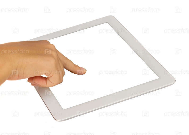 Рука указывает на современный планшетный компьютер