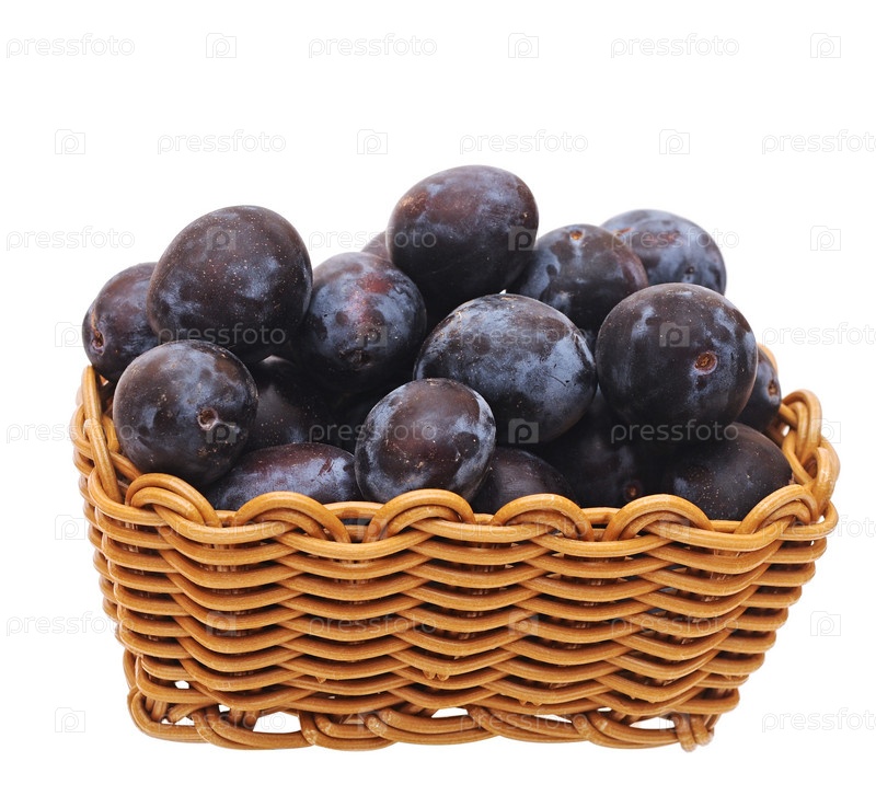 Корзина со сливами на белом фоне