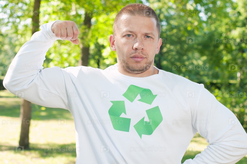 Мужчина в футболке с символом повторной переработки демонстрирует бицепсы