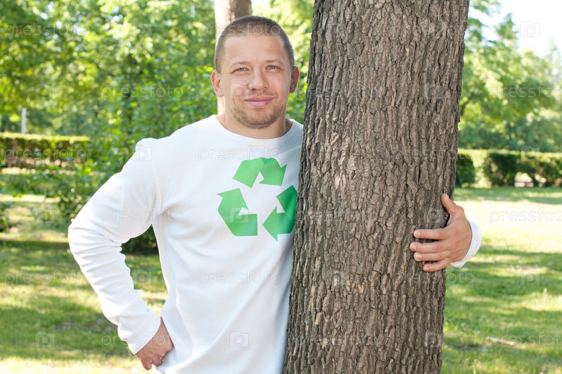 Мужчина с логотипом рециркуляции на рубашке обнимает дерево в парке летом