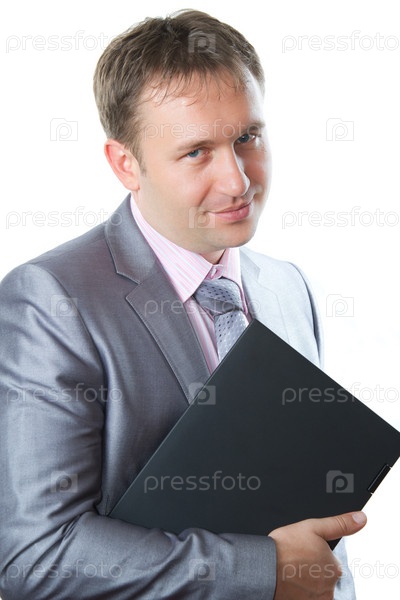 Портрет бизнесмена с папкой на белом фоне. Бизнес и финансы