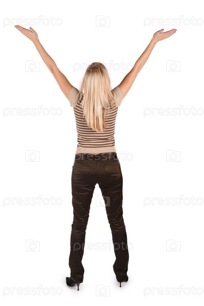 Красивая молодая женщина с поднятыми вверх руками, изолированная на белом