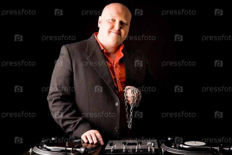 Портрет большого человека, смотрящего в камеру с рукой на виниловой пластинке