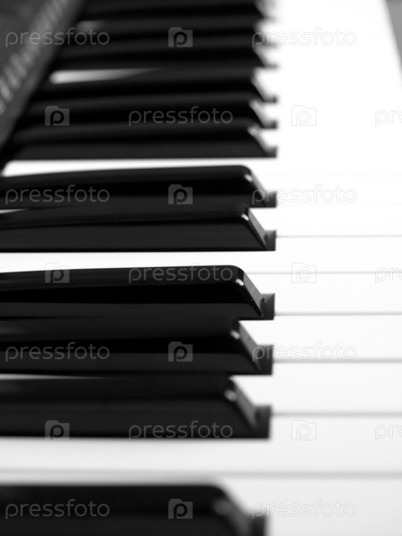 Фрагмент черно-белой клавиатуры музыкального инструмента, выборочный фокус