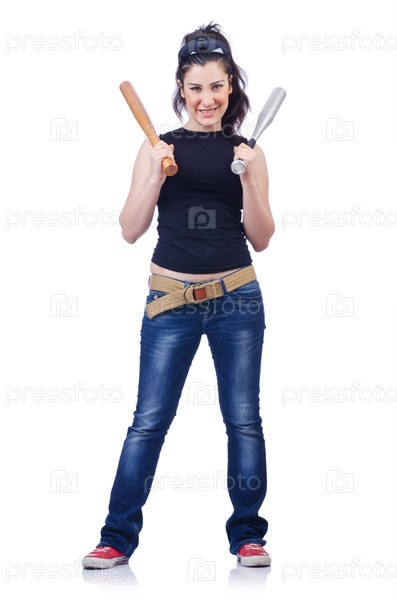 Женщина-преступник с битами на белом фоне