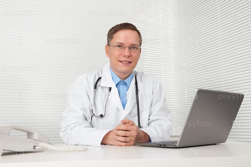 Врач работает на своем ноутбуке за столом в кабинете