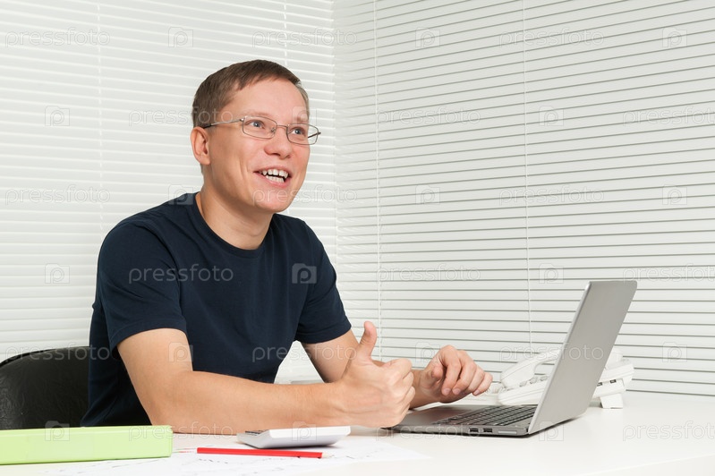 Веселый мужчина с ноутбуком