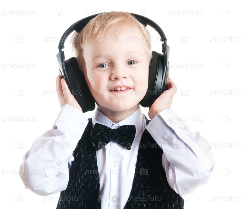 Мальчик в наушниках, изолированный на белом