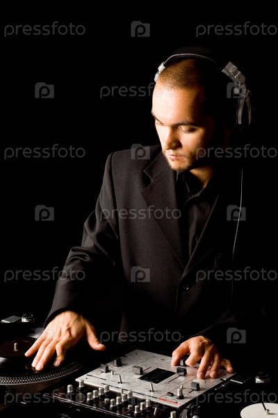 Портрет красавчика-диджея на работе, крутящего проигрыватели