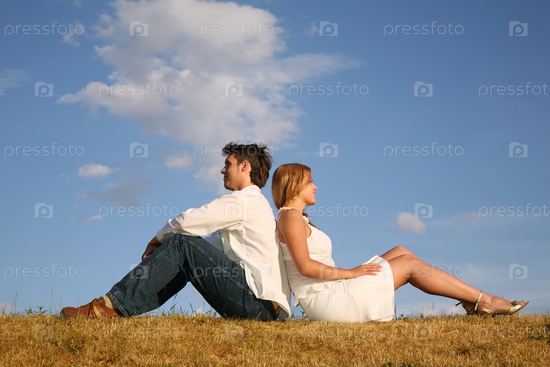 Пара сидит на лугу, на фоне неба