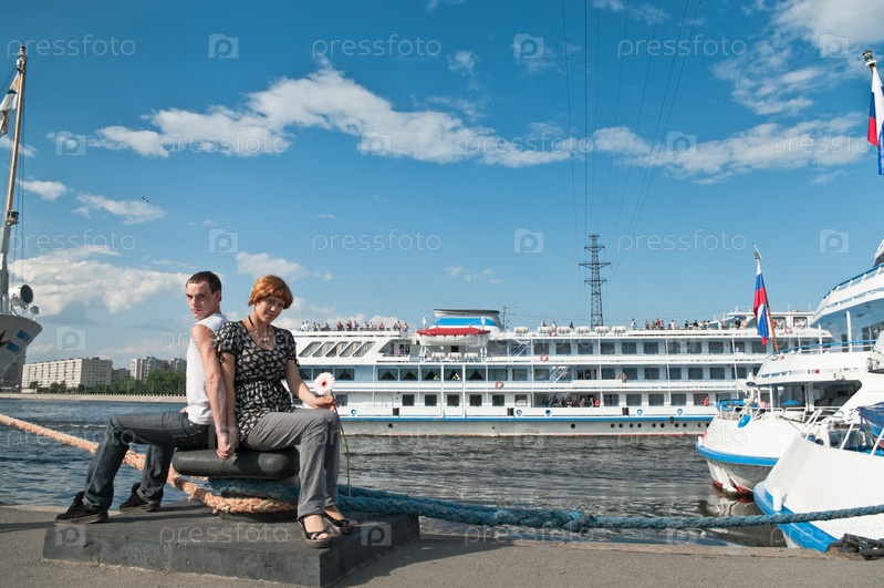 Влюбленная пара сидит в порту возле круизных лайнеров