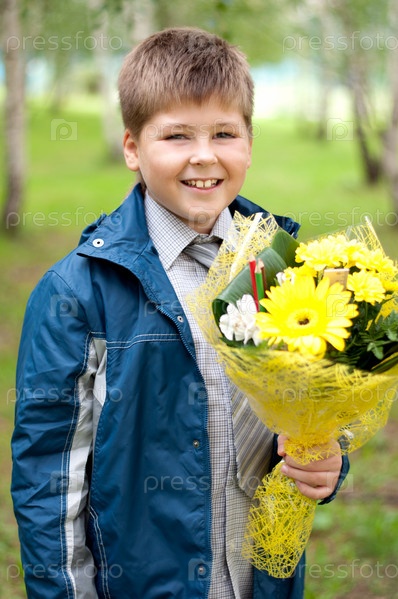 Школьник с букетом желтых хризантем в парке