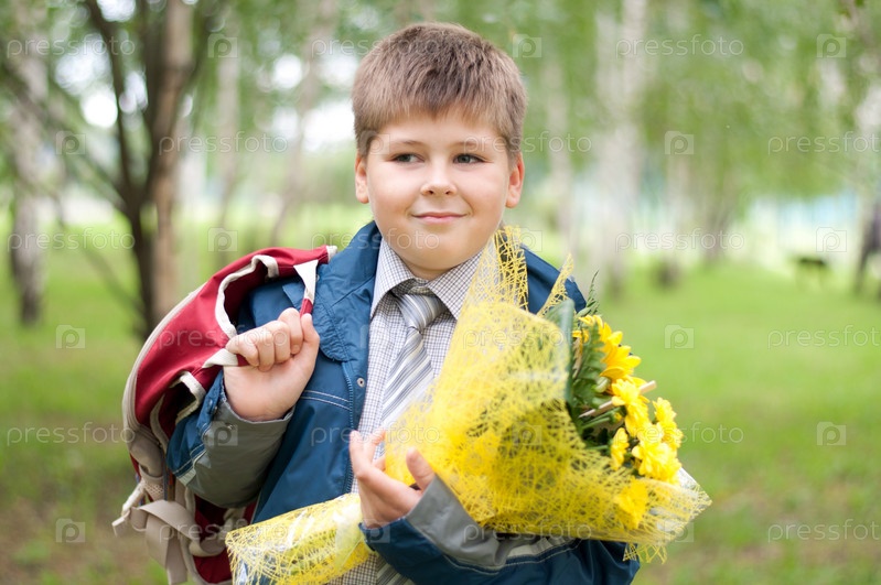 Школьник с букетом желтых хризантем в парке