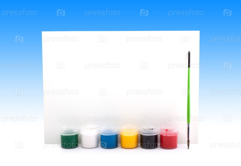 Краски, кисти и бумага на синем фоне