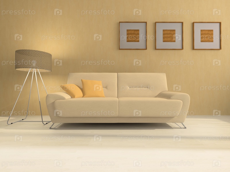 Современный интерьер комнаты с диваном и торшером