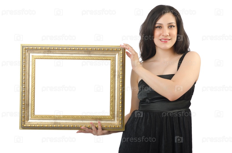 Женщина с фоторамкой на белом фоне