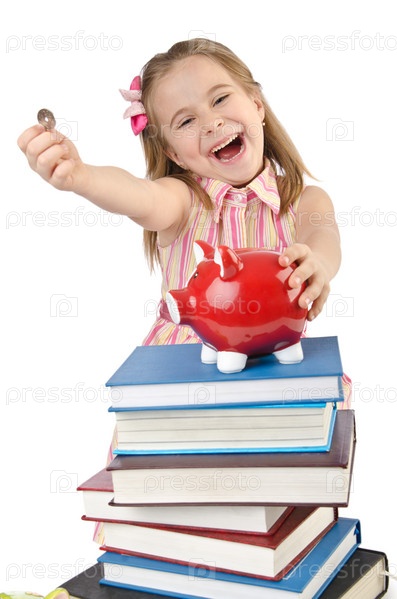 Маленькая девочка с книгами на белом фоне