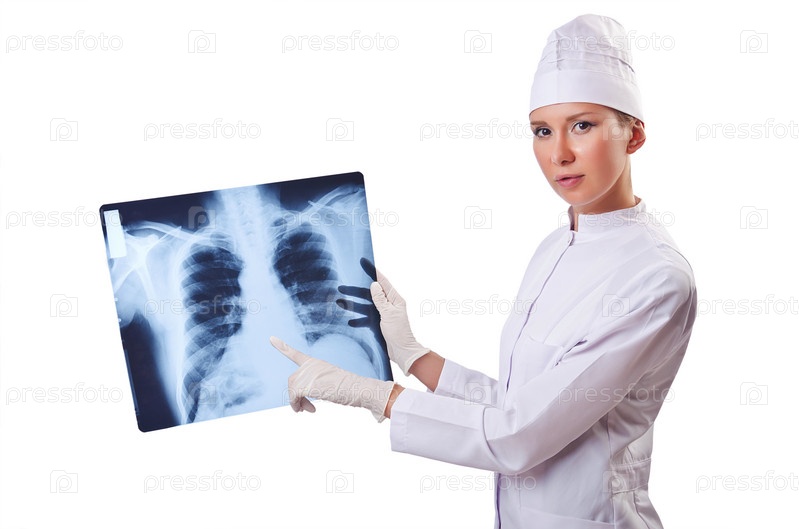 Женщина-врач изучает рентгеновский снимок на белом фоне