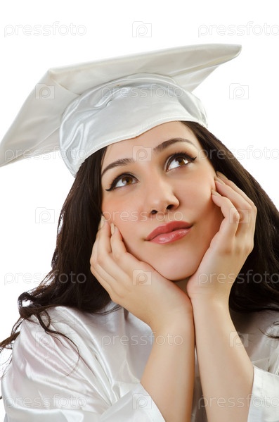 Счастливый студент празднует окончание учебы на белом фоне