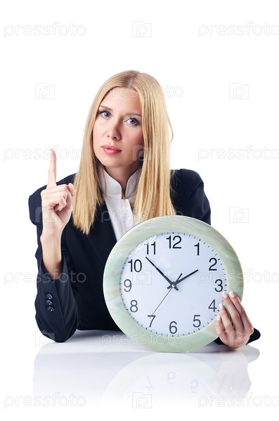 Бизнес-леди с часами, изолированная на белом