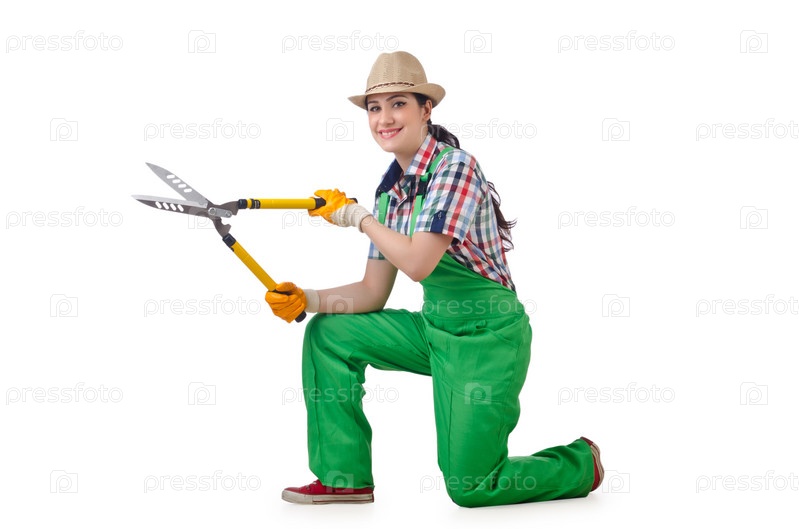 Девушка с садовыми ножницами на белом фоне
