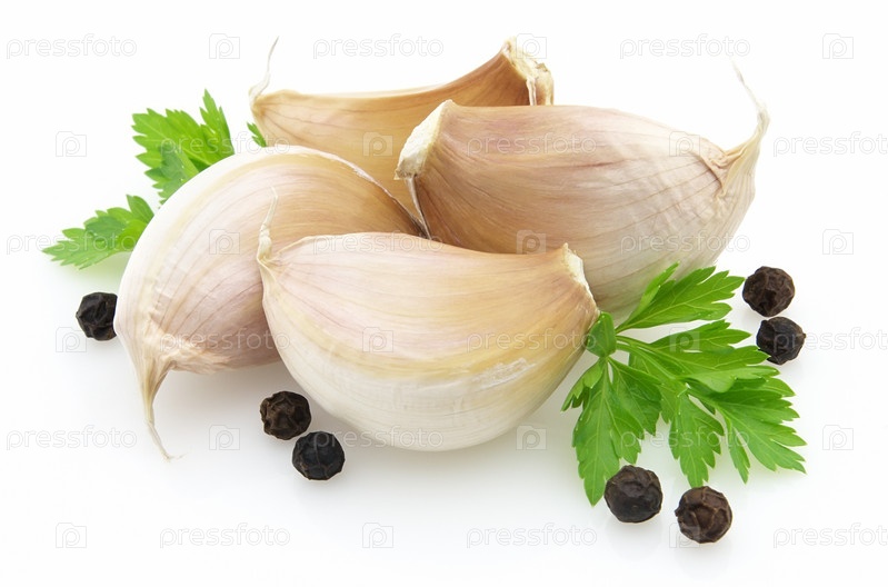 Чеснок, перец и петрушка на белом фоне